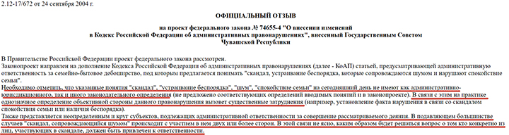 В 2004-м Госсовет Чувашии предложил ввести в КоАП отдельную статью, предусматривающую административную ответственность "за семейно-бытовое дебоширство". Проект отклонили. А официальный отзыв правительства России был такой (выдержка):