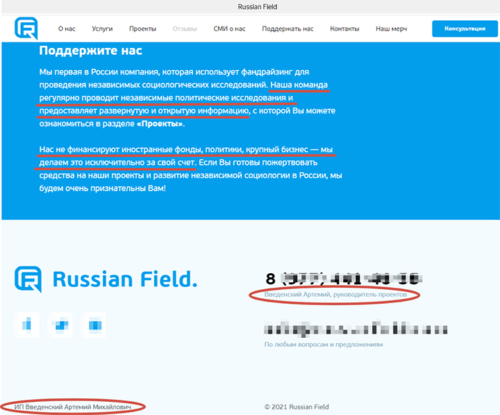 Финансово-хозяйственная деятельность группы осуществляется через ИП руководителя её проектов — Артемия Введенского//Скриншот страницы сайта russianfield.com