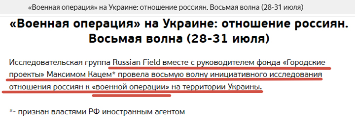 Иноагент Кац* выступал соинициатором "исследований", в которых СВО подчёркнуто взята в кавычки, а результаты, по сути, опровергают настрой общества на победу в спецоперации//Скриншот страницы сайта russianfield.com