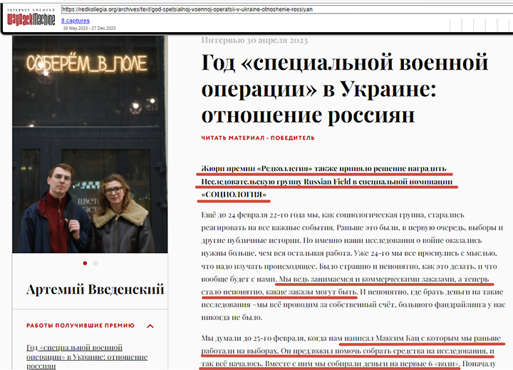 А Russian Field именно за "исследование" настроений русского общества к СВО получила от его фонда посредством "премии" деньги. И мы не удивимся, если вскроется, что финансирование ведётся на регулярной основе.