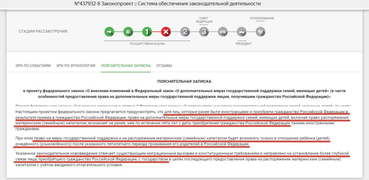 Вот наглядный пример. Чуть больше недели назад парламент отклонил законопроект об установлении права на маткапитал для мигрантов, приобрётших гражданство России, только по истечении пятилетнего срока их проживания в стране.