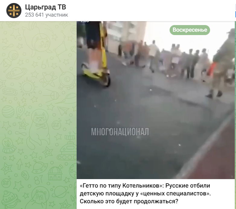 Папы русских детей выгнали обнаглевших взрослых мигрантов, решивших показать свою силу, со спортивной площадки прочь//Скриншот поста из ТГ-канала "Царьград ТВ"
