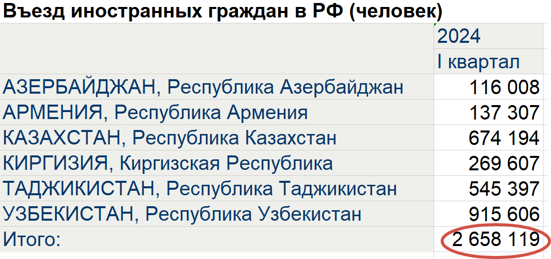 Да, понятно, что для этого "ценным иностранным специалистам" нужно быть легальными: иметь работу, вид на жительство или разрешение на временное проживание. И это без учёта массового получения гражданства, особенно в предыдущие несколько лет, ведь, для понимания, только за предыдущий год его получили почти 700 тыс. человек, а 170 тысяч из них — уроженцы Таджикистана. Причём, по словам начальника Главного управления по вопросам миграции МВД России Валентины Казаковой, больше половины наших новоявленных сограждан — это дети.