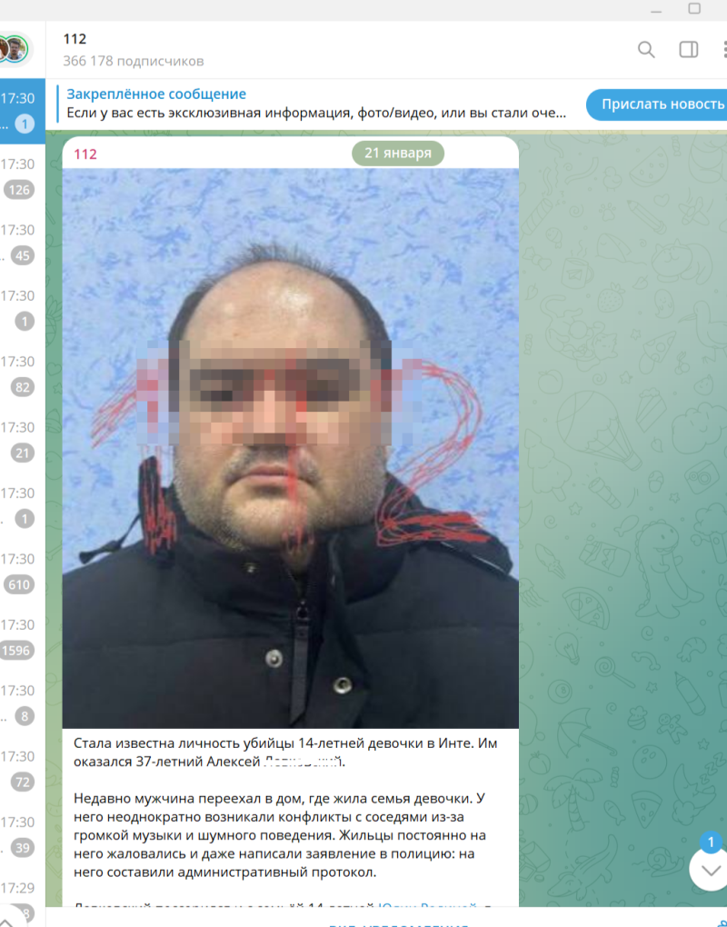Между тем, корреспонденты "112" поговорили с отцом убитой девочки и выяснили, что задержанный сосед и ранее пытался учинить расправу над членами семьи. Задержанного зовут Алексей Л. Семья уже жаловалась на него в органы.