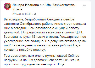 На страничке в Facebook министра труда Республики Башкортостан Ленары Ивановой появился пост о том, что Центр занятости населения г. Уфы предлагает соискателям множество вакансий, но безработные не спешат трудоустраиваться, а предпочитают жить на пособие.