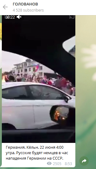 Камера запечатлела, как толпа людей, размахивающих российскими флагами, собирается на сонных улочках, тревожа законопослушных немцев. Слышна русская речь и дружное ликование, напоминающее не только о скорбном дне начала войны, но и о великой победе русских. На фоне происходящего особенно уместным кажется гимн России, звучащий из аудиосистемы автомобиля.