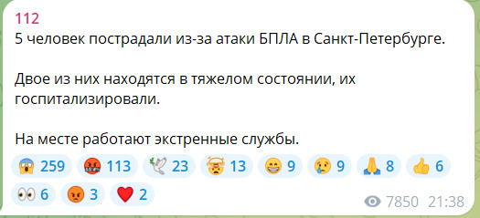 Сразу пять человек пострадали из-за атаки БПЛА в Петербурге, сообщает ТГ-канал "112".