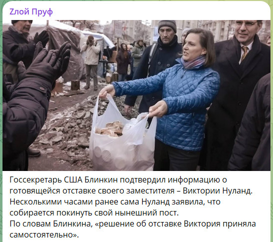 Накануне сообщалось, что Нуланд известила главу американского внешнеполитического ведомства Энтони Блинкена о своих планах уйти в отставку. Именно Нуланд называют одним из главных архитекторов небратского майдана, который с треском провалился, разорив Европу и разрушив однополярную гегемонию доллара в мире. Политика Нуланд не принесла миру ничего, кроме разрушений и страданий.