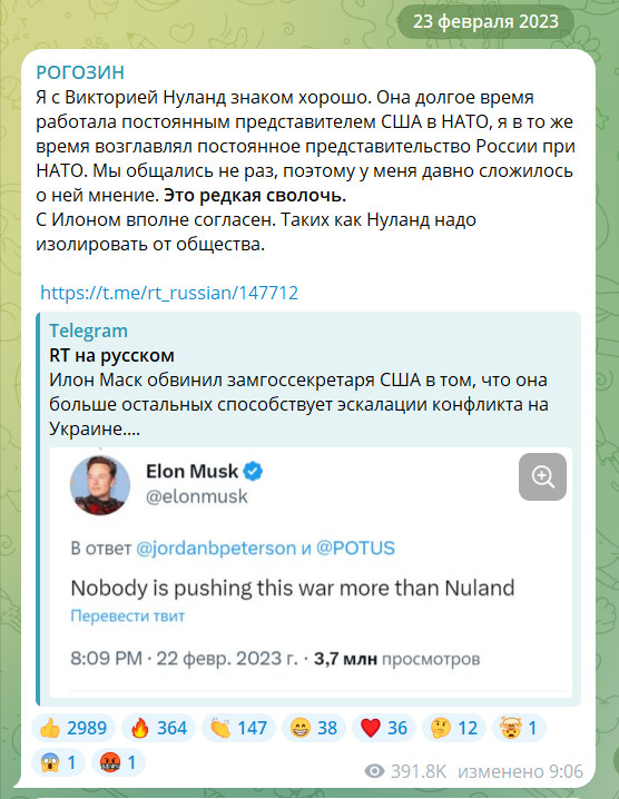 В феврале 2023 года Рогозин дал Нуланд ещё более жёсткую характеристику. Политик тогда прокомментировал твит Илона Маска, посвящённый замгоссекретаря США. По словам Маска, Нуланд сильнее всех "продвигает" эскалацию конфликта на Украине.