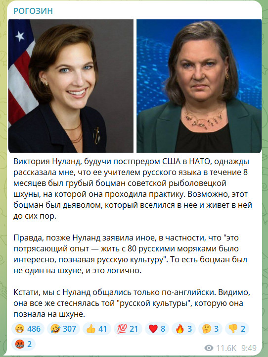 Член Совета Федерации Дмитрий Рогозин предположил, что в замруководителя Госдепартамента США Викторию Нуланд вселился дьявол. Соответствующий пост появился в Telegram-канале русского сенатора.