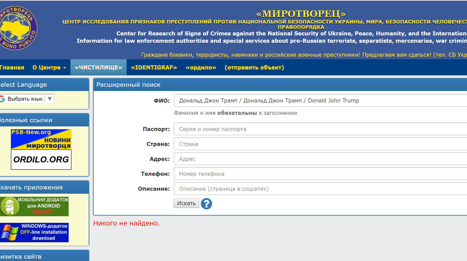 Отметим, что при поиске на сайте «Миротворца» сведений о Трампе в «чистилище» нет.