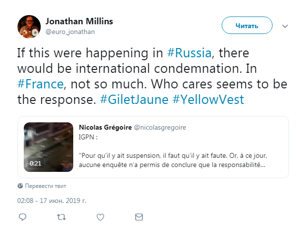 На этот счет высказался бывший глава брюссельского филиала организации East of England, функционирующей под эгидой Европейского союза, Джонатан Милинз: "Если бы такое произошло в России, на нее бы сразу же обрушился шквал международного осуждения. А вот во Франции все совсем не так. Такое ощущение, что всем плевать", - пишет он в своем Twitter-аккаунте. По его словам, жертвой является представитель движения "желтых жилетов", а вот власть, которая, якобы руководствуясь демократическими принципами, призвана защищать права и свободы каждого человека, просто не замечает происходящего. При этом, как вполне резонно утверждает Милинз, если бы подобное произошло в России, европейское сообщество вряд ли смогло бы воздержаться от ярой критики и обвинений в адрес российского руководства, что и происходит сейчас повсеместно.