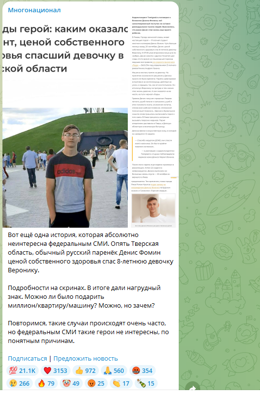 Вот, например, история из Тверской области. там русский подросток Денис Фомин спас незнакомую ему до этого восьмилетнюю Веронику.
