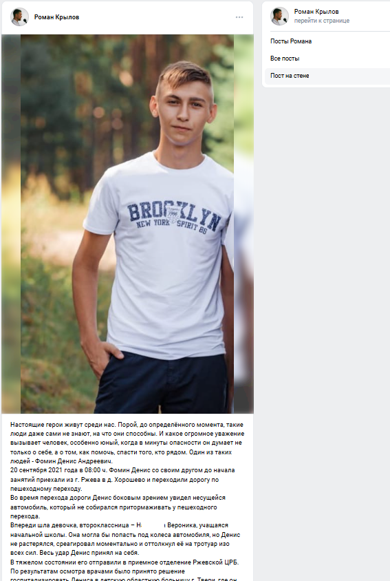 Тяжело травмированного Дениса в критическом состоянии доставили сперва в Ржевскую ЦРБ, а потом – в Детскую областную больницу Твери, где две недели он пролежал в коме. За жизнь парня боролись лучшие врачи Твери и Тверской области. К счастью, героя удалось спасти.