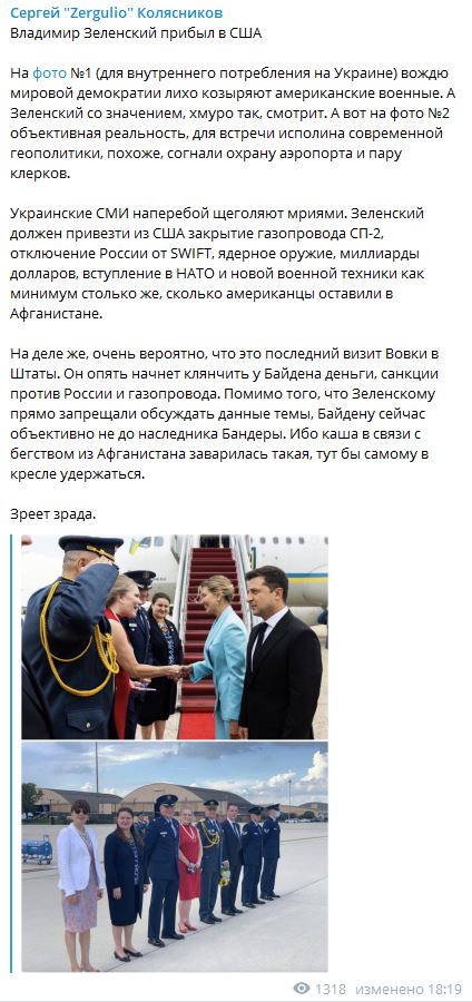 Президент Украины во вторник, наконец, посетил Вашингтон, куда он хотел приехать ещё в начале июля, но всё не получал приглашения. Блогер Сергей "Zergulio" Колясников опубликовал два фото из аэропорта, где приземлился самолёт Зеленского.