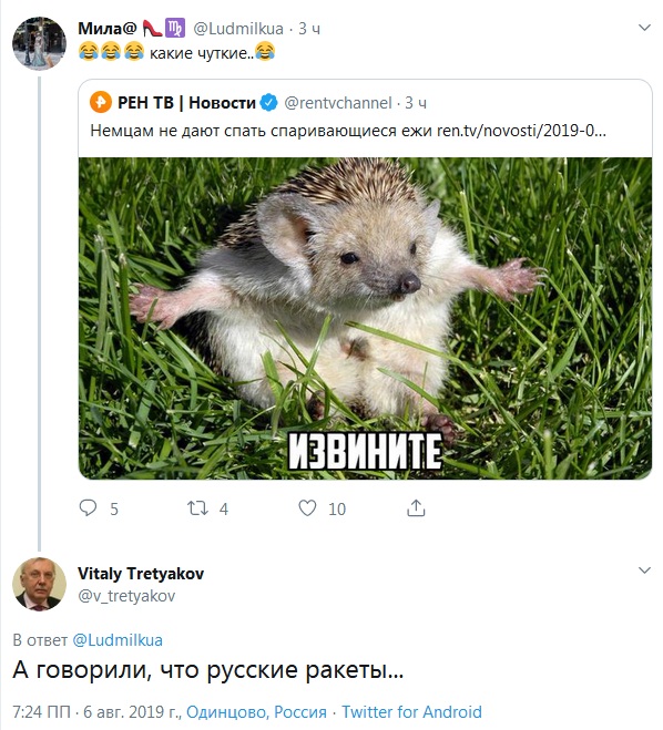 "А говорили, что (мешают спать) русские ракеты", - комментирует новость в Twitter журналист, политолог Виталий Третьяков.