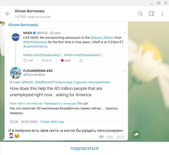 Мы запустили астронавтов на МКС с космодрома NASA впервые за 9 лет. Запуск прошёл в 3:22, - гласит сообщение NASA в Twitter.