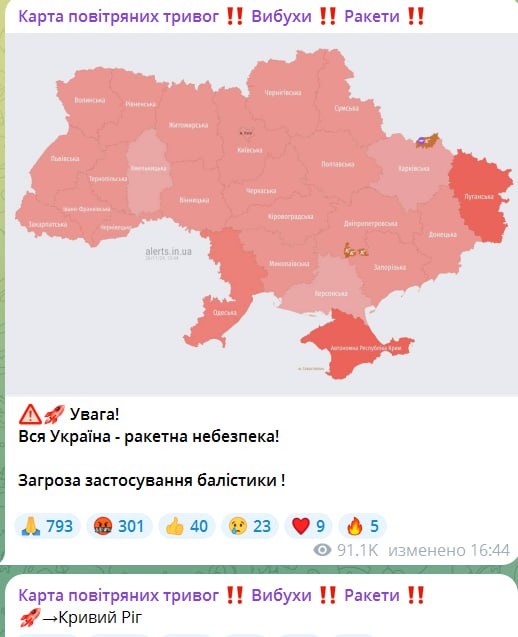 К счастью, долго ждать не пришлось. Не прошло и часа, как воздушная тревога завыла по всей Украине. Мониторинговые службы Украины сообщают о нанесённом ракетном ударе по целям в Кривом Роге. Ждём информации и видео с мест прилётов.