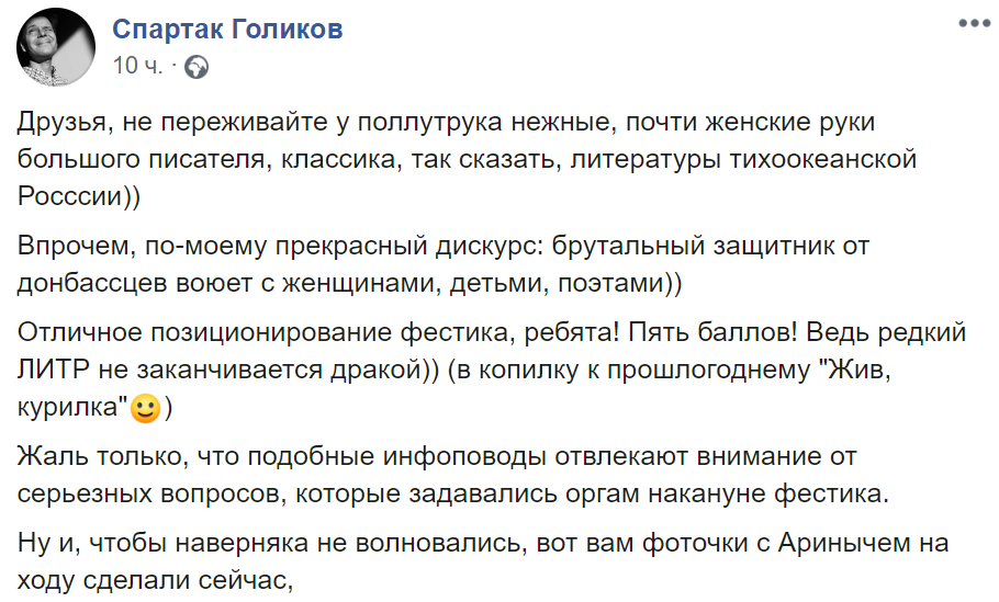 Впрочем, о случившемся Голиков написал на странице в Сети. Он отметил, что "у поллутрука нежные, почти женские руки большого писателя, классика".