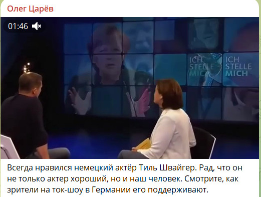 Всегда нравился немецкий актёр Тиль Швайгер. Рад, что он не только актёр хороший, но и наш человек. Смотрите, как зрители на ток-шоу в Германии его поддерживают.