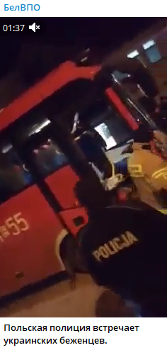 Telegram-канал "БелВПО" показал кадры встречи украинских беженцев. Из автобуса выходят женщины и взрослые мужчины. Встречающие их полицейские "приветствуют" их обильной нецензурщиной, из которой приличными являются только слова: "А страну защищать?"