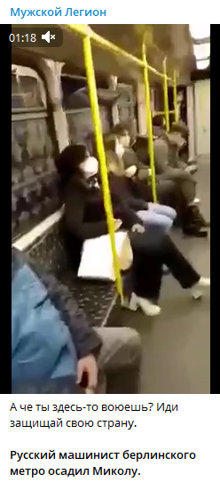 Также нерадостная встреча произошла в берлинском метро. Гражданин Германии русского происхождения, который работает машинистом, осадил украинца-скандалиста. Он призвал мужчину не "воевать" в германском метро, а отправиться со своими амбициями на родину. Тот в ответ, услышав русскую речь, стал угрожать машинисту и пообещал видео с ним распространить в Сети.