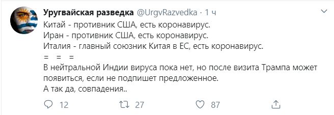 В аккаунте "Уругвайская разведка" сети микроблогов Twitter появился пост, где говорится о распространении коронавируса с точки зрения геополитики. Автор написал, что заболевание появилось в Китае - противнике США. Коронавирус есть и в Иране, а также Италии. Италию назвали "главным союзником Китая" в Евросоюзе.
