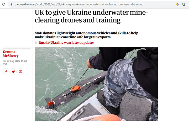 Британское издание The Guardian сообщало о поставках подводных дронов для разминирования на Украину ещё в августе 2022 года. Скриншот сайта theguardian.com