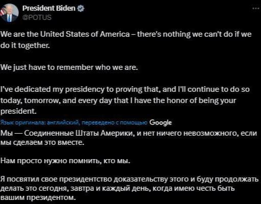 Впрочем, вопросов стало ещё больше, когда несколько часов назад в аккаунте президента в сети X (бывший Twitter) вместо ожидаемого хотя бы минутного видео с Байденом появился очередной пост. Хотя основной всё же один: где Джо?