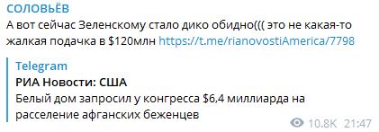 Известный телеведущий Владимир Соловьёв сравнил американскую помощь Украине и Афганистану. "А вот сейчас Зеленскому обидно", - пишет он.