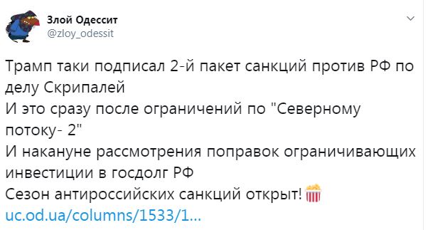 "Сезон антироссийских санкций открыт!" - так микроблогер Злой Одессит ликует в своем Twitter по поводу объявления Соединенными Штатами нового, второго пакета санкций против России.
