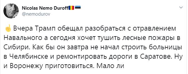 Однако следующий шаг президента США, который позвонил своему российскому коллеге Владимиру Путину и предложил помощь в тушении лесных пожаров в Сибири, озадачил микроблогеров. Как пишет пользователь Nicolas Nemо Duroff, только что Трамп обещал разобраться с "отравлением" Навального, как он уже хочет тушить лесные пожары в Сибири.