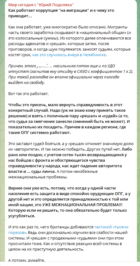 Тему прокомментировал и известный блогер Юрий Подоляка, который раскрыл: по его данным, у мигрантов есть "общак", куда они переводят часть своих доходов. Вот откуда средства на адвокатов, услуги "решал" и взятки.
