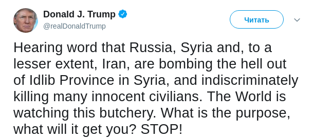 Президент США Дональд Трамп у себя в Twitter голословно обвинил Россию, а также Сирию и Иран в том, что они якобы "адски бомбят" провинцию Идлиб и убивают мирных жителей. Глава Белого дома призвал все три страны прекратить бомбардировки в регионе.