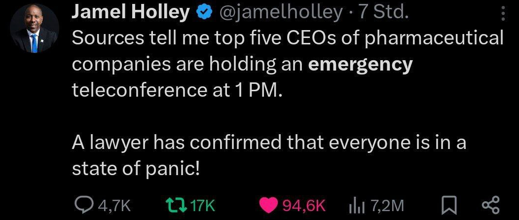 В американском истеблишменте появляются сообщения о нарастающей панике в рядах крупнейших фармацевтических компаний США. Американский политик, представитель демократов Джамел Холли, ссылаясь на свои источники, сообщил, что аж пять руководителей фармацевтических компаний готовят экстренную телеконференцию.