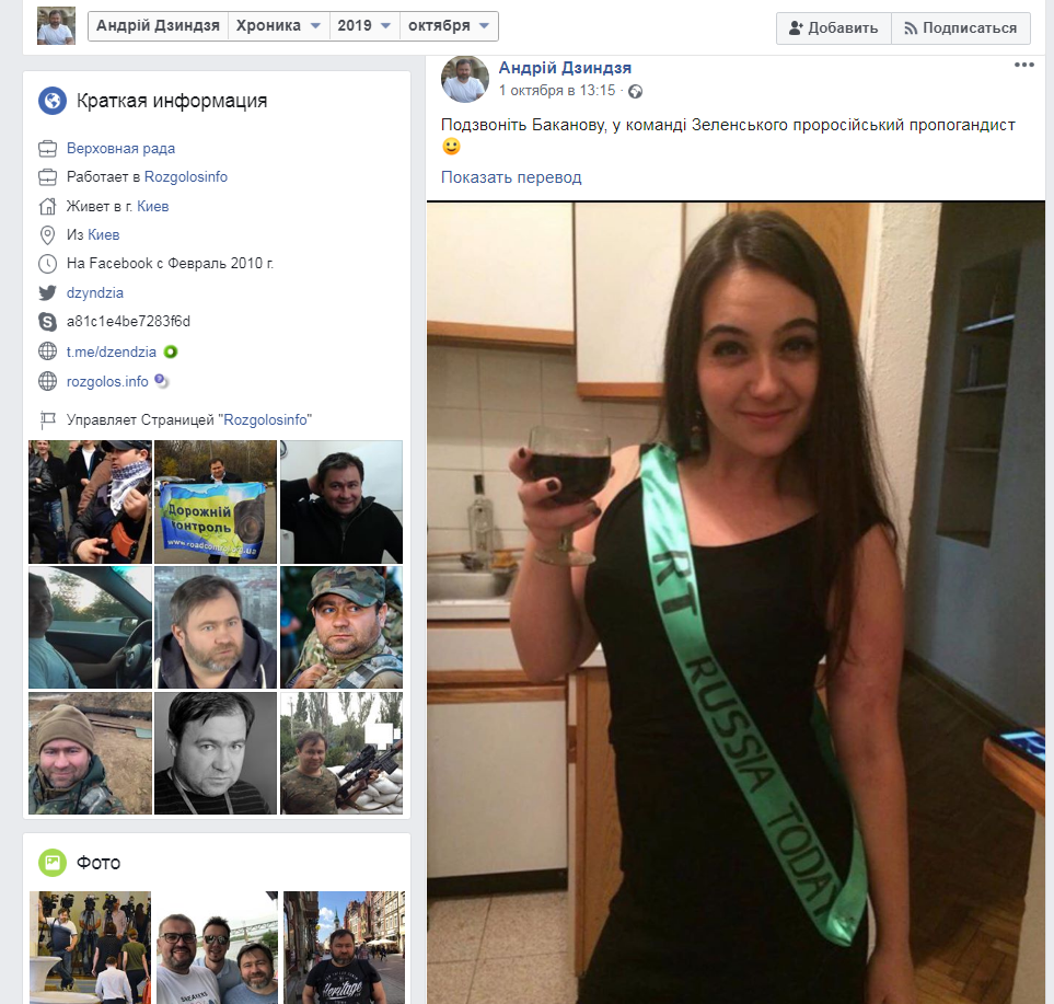 "Подпись к фотографии гласит: Позвоните Баканову (главе СБУ - ред.), в команде у Зеленского пророссийский пропагандист". На фотографии Юлия стоит с бокалом вина в руке. Но самое "страшное" для любого "щирого украинского патриота" - это лента с надписью "RT. Russia Today", перекинутая через плечо Юлии.