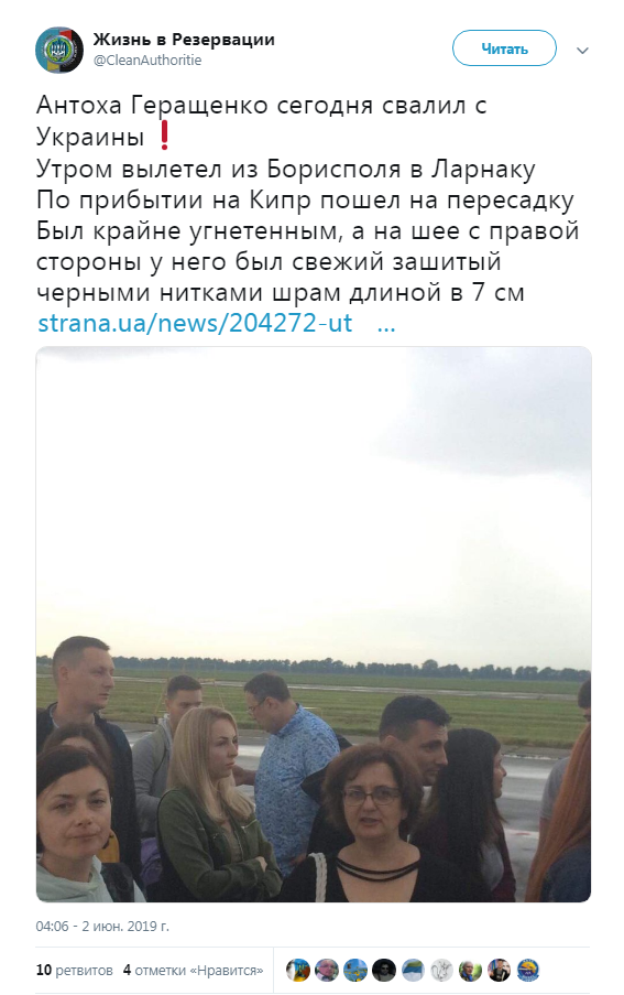 Вылетел Геращенко из киевского аэропорта в Ларнаку лоукостером skyup в 6:30 утра. Однако на Кипре, по словам очевидцев, он не остался, а пошёл на пересадку на другой рейс. Дальнейший маршрут депутата остался неизвестным, пишет "Страна.UA".