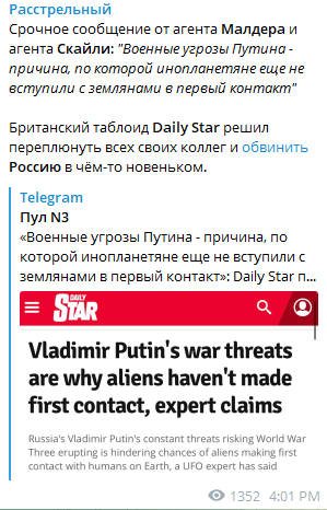 Британский таблоид Daily Star сообщил сенсационную новость о России. Издание, ссылаясь на экспертов, утверждает, что первый контакт человечества с инопланетянами до сих пор не состоялся только из-за Путина и его "военных угроз". Материал вышел под заголовком "Военные угрозы Владимира Путина - это причина, почему пришельцы до сих пор не установили с нами первый контакт, утверждают эксперты".