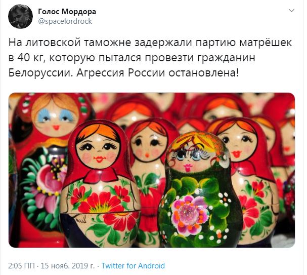 Литовские таможенники задержали в пункте пропуска "Мядининкай" ("Каменный Лог") белоруса, пытавшегося провезти через границу контрабандой груз матрёшек. "Агрессия России остановлена!" - иронизируют пользователи соцсетей.