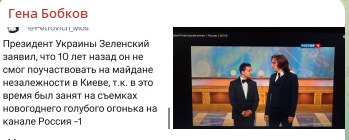 А секрет в том, что все (во всяком случае, в России - к украинцам большой вопрос) прекрасно помнят, что пока одни прыгали и жгли покрышки в Киеве, Владимир Зеленский был занят зарабатыванием денег в Москве. И во время майдана он снимался в нашем "Голубом огоньке", который готовят заранее, до наступления новогодних праздников.
