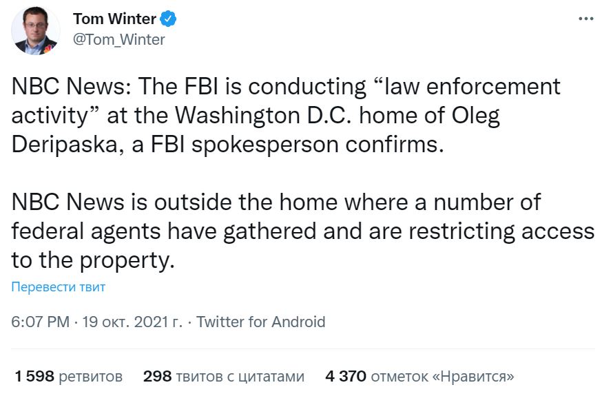 Сотрудники ФБР во вторник провели обыск в вашингтонском доме русского миллиардера Олега Дерипаски. Информацию об этом распространили корреспонденты телеканала NBC News Том Винтер и Лора Стиклер.