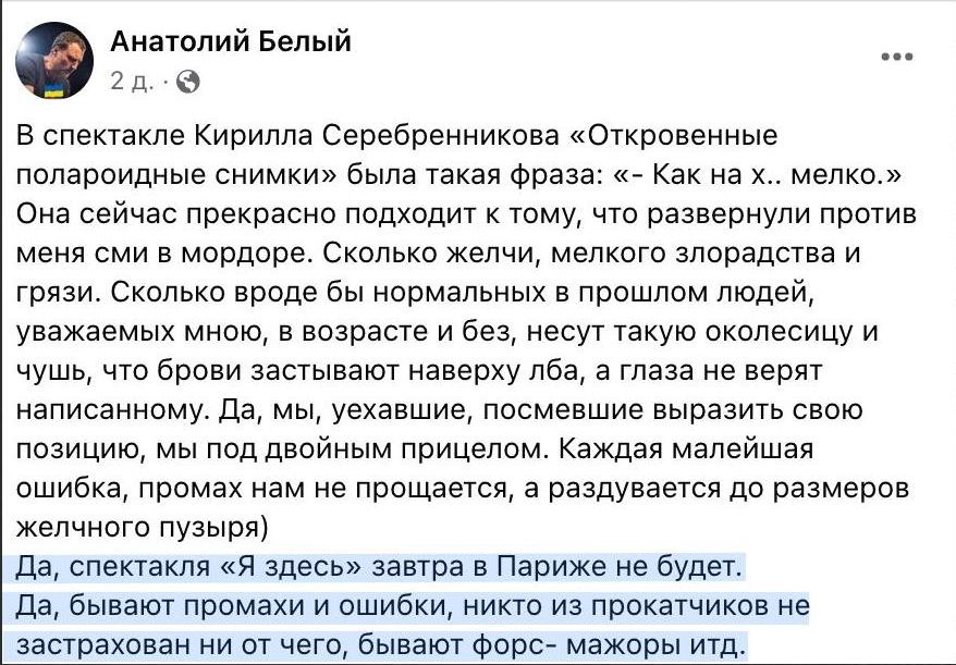 Сообщение Анатолия Белого (Вайсмана) по поводу отмены своего парижского спектакля. Скриншот: телеграм-канал "Медиакинез"