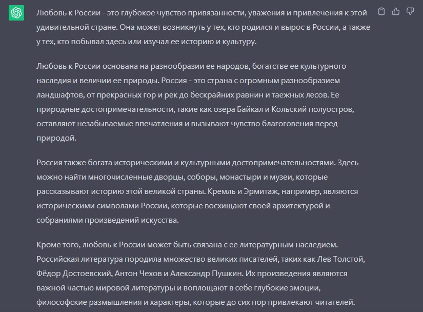 Довольно странное решение, учитывая, что даже американский ChatGPT, известный своей политической предвзятостью, не имеет никаких проблем с тем, чтобы описать любовь к России. На соответствующий запрос нейросеть сгенерировала целое эссе, в котором упомянула все достоинства нашей страны.