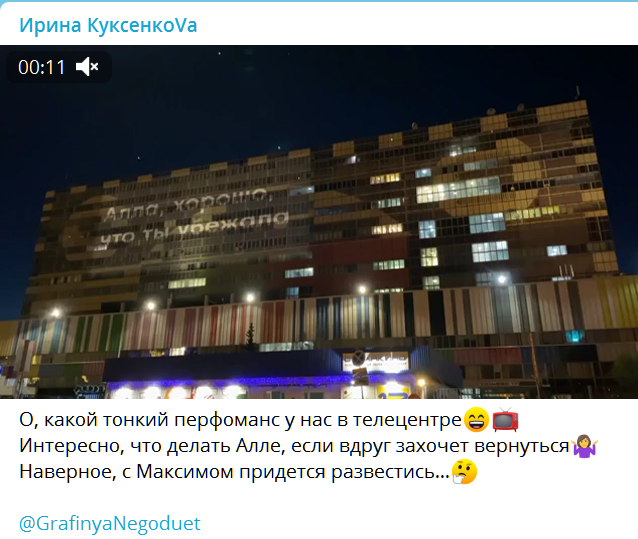 Журналист ВГТРК Ирина Куксенкова в своём телеграм-канале опубликовала видео с обращением к певице Алле Борисовне Пугачёвой, которое появилось на стене телецентра Останкино.
