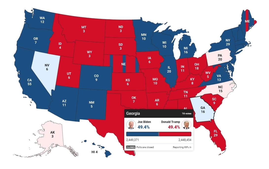- В Джорджии 99% (пока Трамп 49,4%, Байден 49,4%).