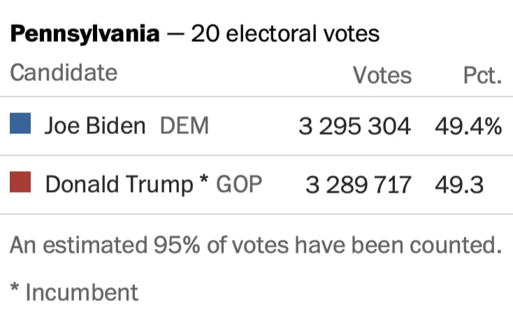 - В Пенсильвании 95% (пока Трамп 49,6%, Байден 49,3%).