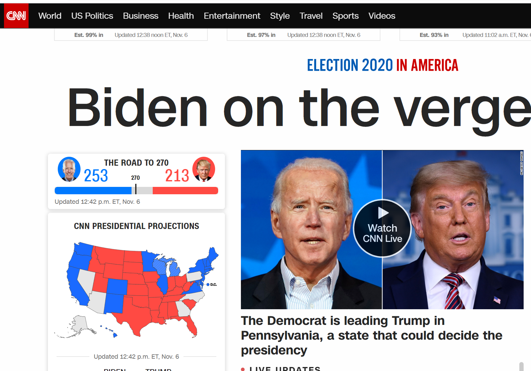 16:57 Промежуточные итоги выборов. К утру Джо Байден перехватывает и Пенсильванию. И если лидерство здесь удаётся удержать, исход выборов предрешён. С учётом Пенсильвании демократ лидирует в штатах, которые дают в сумме 306 выборщиков (для победы нужно 270).