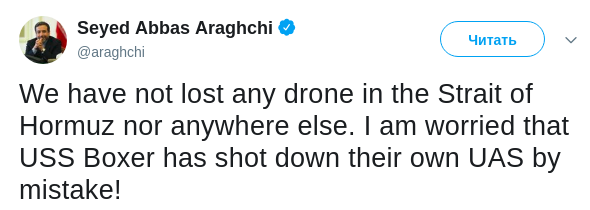 "Мы не теряли никакого беспилотника ни в Ормузском проливе, ни где-либо еще, - четко объяснил Аббас Аракчи. - Я обеспокоен тем, что USS Boxer по ошибке сбил их собственные UAS!"