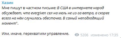 Мне пишут в частном письме: "В США в интернете народ обсуждает, что Ever Given сел на мель не из-за ветра, а, скорее всего, на нём случилась обесточка. В самый неподходящий момент". Или, иначе, перехватили управление, - пишет Хазин в Telegram.