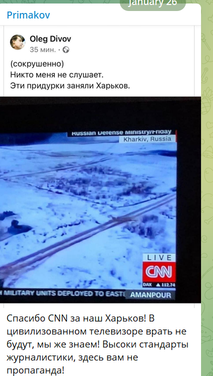 Журналист Евгений Примаков в своём телеграм-канале не удержался от иронии: "Спасибо CNN за наш Харьков!"
